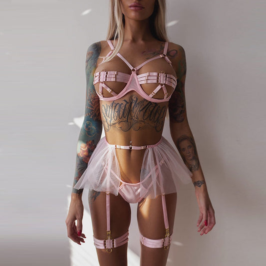 Seductive Bandage Exotic Lingerie Set: Fancy Mesh Garter Cut Out Bra
